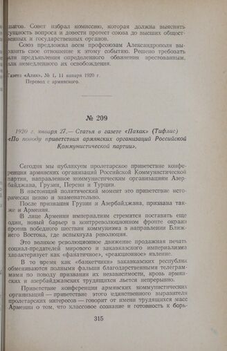 1920 г. января 27. — Статья в газете «Пахак» (Тифлис) «По поводу приветствия армянских организаций Российской Коммунистической партии»