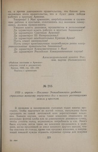 1920 г. апрель. — Послание Эчмиадзинского уездного управления министру внутренних дел о захвате ростовщиками земель у крестьян