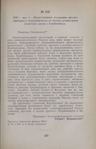 1920 г. мая 1. — Приветственная телеграмма митинга трудящихся Александрополя по поводу установления Советской власти в Азербайджане