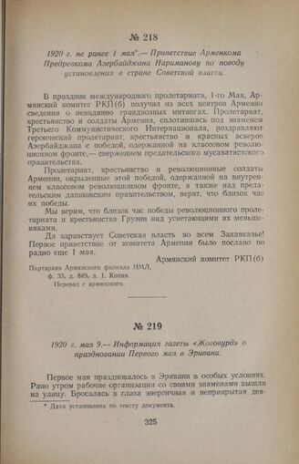 1920 г. не ранее 1 мая. — Приветствие Арменкома Предревкома Азербайджана Нариманову по поводу установления в стране Советской власти // Партархив Армянского филиала ИМЛ, ф. 33, д. 849, л. 1. Копия.