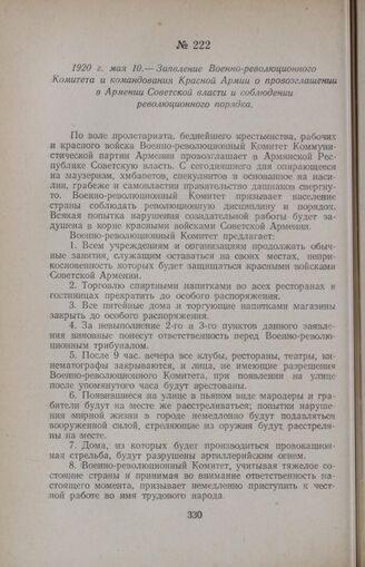 1920 г. мая 10. — Заявление Военно-революционного Комитета и командования Красной Армии о провозглашении в Армении Советской власти и соблюдении революционного порядка. Александрополь