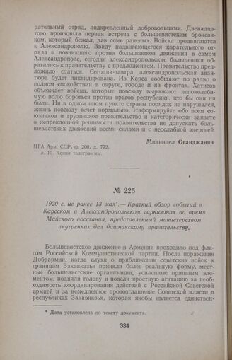 1920 г. не ранее 13 мая. — Краткий обзор событий в Карсском и Александропольском гарнизонах во время Майского восстания, представленный министерством внутренних дел дашнакскому правительству