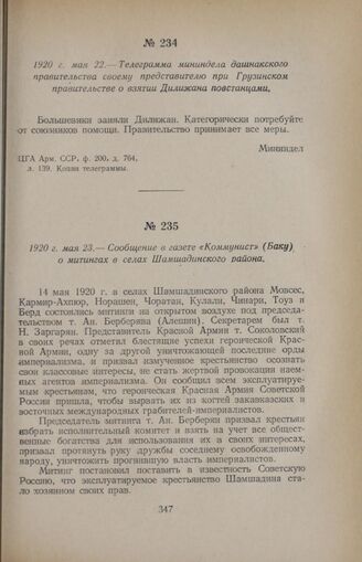 1920 г. мая 22. — Телеграмма мининдела дашнакского правительства своему представителю при Грузинском правительстве о взятии Дилижана повстанцами // ЦГА Арм. ССР, ф. 200, д. 764, л. 139. Копия телеграммы.
