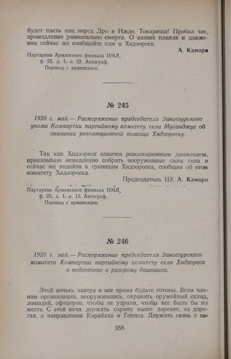1920 г. май. — Распоряжение председателя Зангезурского укома Компартии партийному комитету села Муганджуг об оказании революционной помощи Хндзореску // Партархив Армянского филиала ИМЛ, ф. 25, д. 1, л. 13. Автограф.