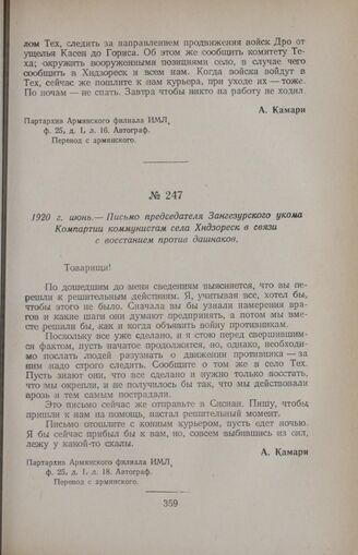 1920 г. июнь. — Письмо председателя Зангезурского укома Компартии коммунистам села Хндзореск в связи с восстанием против дашнаков // Партархив Армянского филиала ИМЛ, ф. 25, д. 1, л. 18. Автограф.