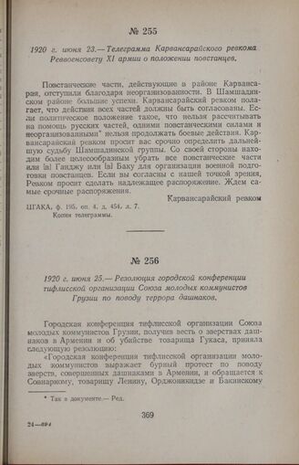 1920 г. июня 23. — Телеграмма Карвансарайского ревкома Реввоенсовету XI армии о положении повстанцев // ЦГАКА, ф. 195, оп. 4, д. 454, л. 7. Копия телеграммы.