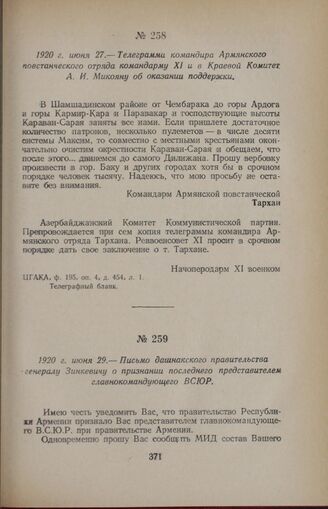 1920 г. июня 29. — Письмо дашнакского правительства генералу Зинкевичу о признании последнего представителем главнокомандующего ВСЮР // ЦГА Арм. ССР, ф. 200, д. 424, л. 35. Подлинник.