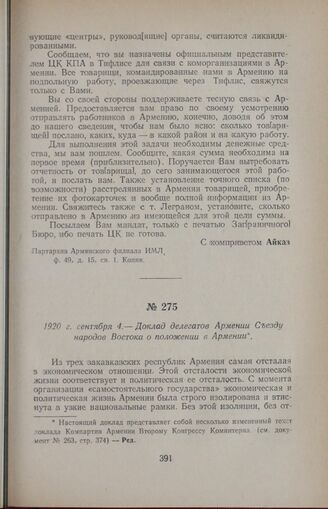 1920 г. сентября 4. — Доклад делегатов Армении Съезду народов Восто...