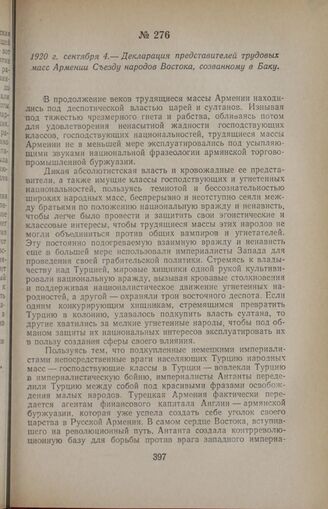 1920 г. сентября 4. — Декларация представителей трудовых масс Армении Съезду народов Востока, созванному в Баку