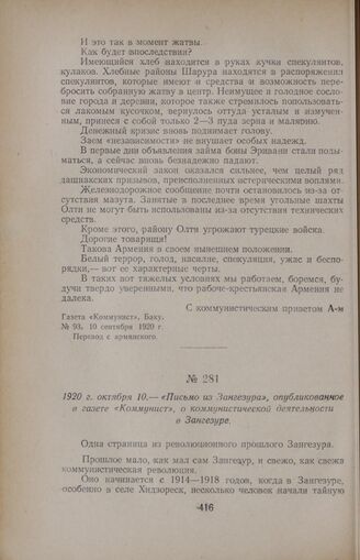 1920 г. октября 10. — «Письмо из Зангезура», опубликованное в газете «Коммунист», о коммунистической деятельности в Зангезуре // Газета «Коммунист», Баку, № 127, 20 октября 1920 г.