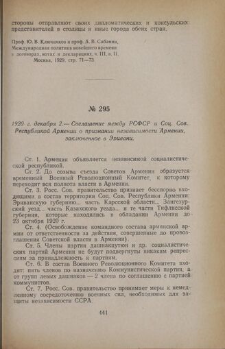 1920 г. декабря 2. — Соглашение между РСФСР и Соц. Сов. Республикой Армении о признании независимости Армении, заключенное в Эривани // Проф. Ю. В. Ключников и проф. А. В. Сабанин, Международная политика новейшего времени в договорах, нотах и декларациях, ч. III, в. I, Москва, 1928, стр. 75—76.