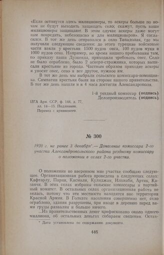 1920 г. не ранее 3 декабря. — Донесение комиссара 2-го участка Александропольского района уездному комиссару о положении в селах 2-го участка // ЦГА Арм. ССР, ф. 144, д. 73, л. 40. Подлинник.