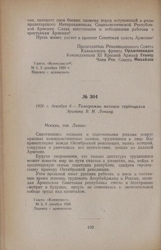 1920 г. декабря 6. — Телеграмма митинга трудящихся Эривани В. И. Ленину // Газета «Коммунист», № 3, 8 декабря 1920.