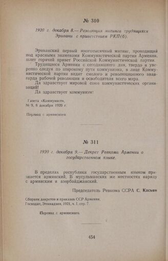 1920 г. декабря 9. — Декрет Ревкома Армении о государственном языке // Сборник декретов и приказов ССР Армении, Госиздат, Эчмиадзин, 1921, ч. I, стр. 7.