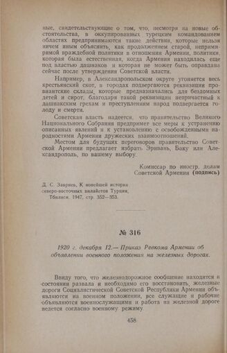1920 г. декабря 12. — Приказ Ревкома Армении об объявлении военного положения на железных дорогах // Сборник декретов и приказов ССР Армении, Госиздат, Эчмиадзин, 1921, ч. I, стр. 10.