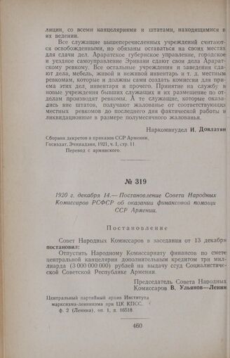 1920 г. декабря 14. — Постановление Совета Народных Комиссаров РСФСР об оказании финансовой помощи ССР Армении // Центральный партийный архив Института марксизма-ленинизма при ЦК КПСС, ф. 2 (Ленина), оп. 1, д. 16518.