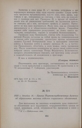 1920 г. декабря 16. — Приказ Наркомсоцобеспечения Армении об образовании местных отделов социального обеспечения // Сборник декретов и приказов ССР Армении, Госиздат, Эчмиадзин, 1921, ч. I, стр. 15.