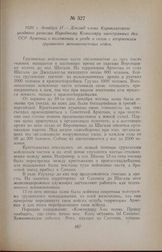 1920 г. декабря 17. — Доклад члена Караклисского уездного ревкома Народному Комиссару иностранных дел ССР Армении о положении в уезде в связи с вторжением грузинских меньшевистских войск