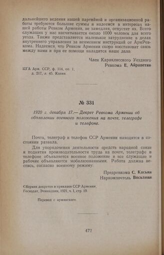 1920 г. декабря 17. — Декрет Ревкома Армении об объявлении военного положения на почте, телеграфе и телефоне // Сборник декретов и приказов ССР Армении, Госиздат, Эчмиадзин, 1921, ч. I, стр. 19.