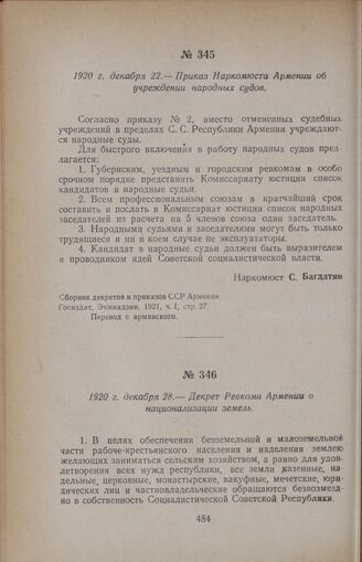 1920 г. декабря 22. — Приказ Наркомюста Армении об учреждении народных судов // Сборник декретов и приказов ССР Армении, Госиздат, Эчмиадзин, 1921, ч. I, стр. 27.