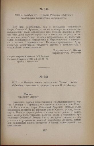 1920 г. декабря 31. — Приказ Ревкома Армении о регистрации технических специалистов // Сборник декретов и приказов ССР Армении, Госиздат, Эчмиадзин, 1921, ч. I, стр. 41—42.