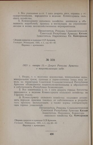 І921 г. января 11. — Декрет Ревкома Армении о национализации недр // Сборник декретов и приказов ССР Армении, Госиздат, Эчмиадзин, 1921, ч. I, стр. 62—63.