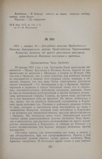1921 г. января 24. — Докладная записка Председателя Ревкома Аштаракского района Председателю Чрезвычайной Комиссии Армении об аресте участников расстрела руководителей Майского восстания и протокол
