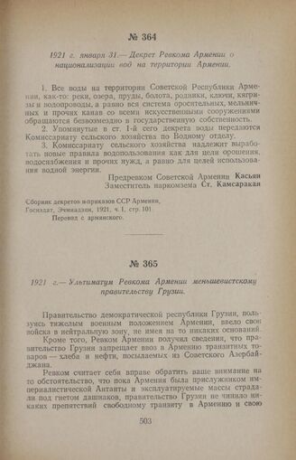 1921 г. — Ультиматум Ревкома Армении меньшевистскому правительству Грузии // Партархив Армянского филиала ИМЛ, ф. 33, д. 1054, стр. 1. Копия.