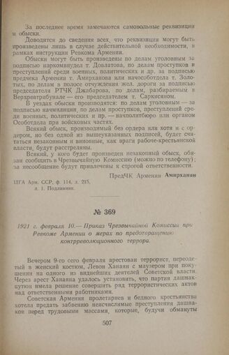 1921 г. февраля 10. — Приказ Чрезвычайной Комиссии при Ревкоме Армении о мерах по предотвращению контрреволюционного террора // ЦГА Арм. ССР, ф. 113, оп. 3, д. 3, л. 73. Подлинник.
