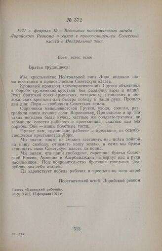 1921 г. февраля 15. — Воззвание повстанческого штаба Лорийского Ревкома в связи с провозглашением Советской власти в Нейтральной зоне
