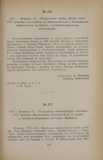 1921 г. февраля 17. — Телеграмма командующего войсками ССР Армении Молкочанова Реввоенсовету XI армии о контрреволюционном восстании дашнаков