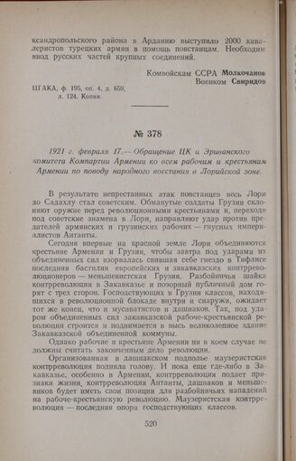 1921 г. февраля 17. — Обращение ЦК и Эриванского комитета Компартии Армении ко всем рабочим и крестьянам Армении по поводу народного восстания в Лорийской зоне