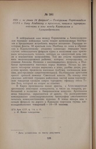 1921 г. не ранее 24 февраля. — Телеграмма Наркоминдела ССРА в Баку Атабекову о произволе, чинимом турецкими войсками в зоне между Караклисом и Александрополем // ЦГА Арм. ССР, ф. 114, д. 11, л. 45. Копия телеграммы.