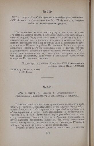 1921 г. марта 8. — Радиограмма командующего войсками ССР Армении в Оперативный отдел XI Армии о положении войск на Камарлинском фронте