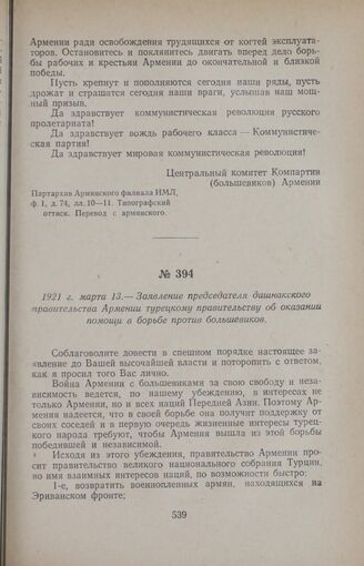 1921 г. марта 13. — Заявление председателя дашнакского правительства Армении турецкому правительству об оказании помощи в борьбе против большевиков // ЦГА Арм. ССР, ф. 208, д. 5, стр. 9. Копия.