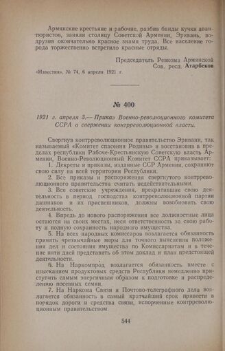 1921 г. апреля 3. — Приказ Военно-революционного комитета ССРА о свержении контрреволюционной власти // Сборник декретов и приказов, Госиздат, Эчмиадзин, 1921, ч. II, стр. 3—4.