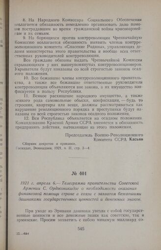 1921 г. апреля 6. — Телеграмма правительства Советской Армении С. Орджоникидзе о необходимости оказания финансовой помощи стране в связи с захватом бежавшими дашнаками государственных ценностей и денежных знаков // ЦГАКА, ф. 195, оп. 4, д. 750, л. 9. Копия.