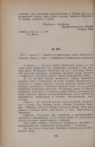 1921 г. апреля 8. — Приказ по артиллерии войск Армянской Красной Армии в связи с ликвидацией дашнакской авантюры // ЦГА Арм. ССР, ф. XI армии, лл. 53—54. Копия.