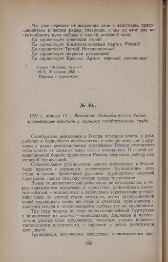 1921 г. апреля 12. — Воззвание Эчмиадзинского Укома, призывающее крестьян к мирному созидательному труду