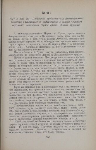 1921 г. мая 20. — Показание представителя Американского комитета в Караклисе об обнаружении в районе Агбулага огромного количества трупов армян, убитых турками // ЦГА Арм. ССР, ф. 114, д. 230, л. 8. Копия.