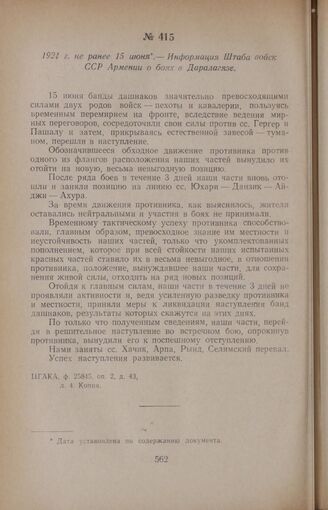 1921 г. не ранее 15 июня. — Информация Штаба войск ССР Армении о боях в Даралагязе // ЦГАКА, ф. 25845, оп. 2, д. 43, л. 4. Копия.