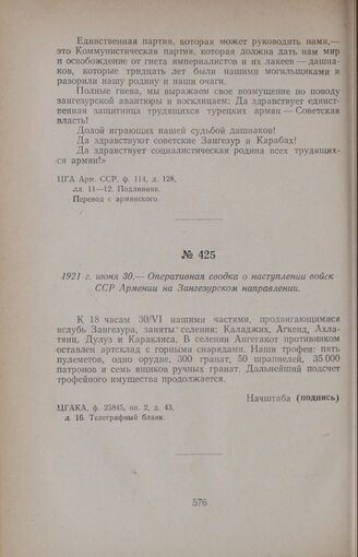 4921 г. июня 30. — Оперативная сводка о наступлении войск ССР Армении на Зангезурском направлении // ЦГАКА, ф. 25845, оп. 2, д. 43, л. 16. Телеграфный бланк.