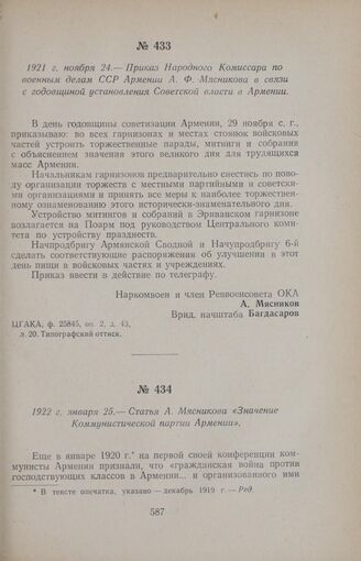 1922 г. января 25. — Статья А. Мясникова «Значение Коммунистической партии Армении» // «Известия Центрального Комитета Коммунистической партии Армении (большевиков)», 1922, № 1, стр. 7—13.