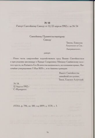 Рапорт Святейшему Синоду от 12/25 апреля 1902 г. за № 54. С.-Франциско // РГИА, ф. 796, оп. 180, год 1899, д. 3578, л. 3.