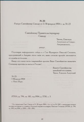 Рапорт Святейшему Синоду от 5/18 февраля 1904 г. за № 23. Нью-Йорк // РГИА, ф. 796, оп. 185, год 1904, д. 5750, л. 3.