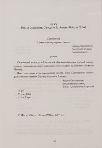 Рапорт Святейшему Синоду от 2/15 июня 1905 г. за № 161. Нью-Йорк // РГИА, ф. 796, оп. 186, год 1905, д. 5907, л. 3.