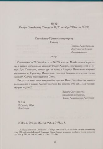 Рапорт Святейшему Синоду от 12/25 октября 1906 г. за № 218. Нью-Йорк // РГИА, ф. 796, on. 187, год 1906, д. 7473, л. 4.