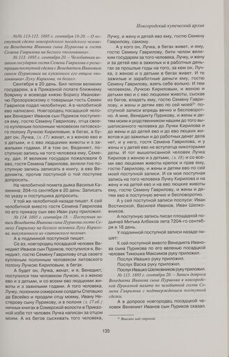 Челобитная великим государям гостя Семена Гаврилова о регистрации поступной сделки с Венедиктом Ивановым сыном Пуриковым на купленного его отцом «полоняника» Луку Кирилова, «в бегах». 1695 г. сентября 20 // ГИАНО. Ф. 717. Оп. 1. Д. 52. Л. 1-88об.
