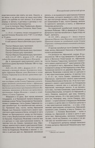 Челобитная великим государям гостя Семена Гаврилова о регистрации меновной и поступной сделок с Афанасием Юрьевым сыном Никоновым, поступившимся гостю беглым крепостным крестьянином Климом Васильевым, вымененым за беглого же крепостного крестьянина Андрея Яковлева с семьей и хозяйством у Семена Гаврилова. 1690 г. февраля 13 // ГИАНО. Ф. 717. Оп. 1. Д. 52. Л. 1-88об.
