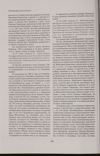 Меновная запись Никифора Клементьева сына Кузьмина гостю Семену Гаврилову на крепостного крестьянина Максима Кирилова с семьею и хозяйством, сбежавшего из Белозерского уезда Надпорожского стана Ворбозомской волости деревни Ступина, за беглого же крепостного крестьянина гостя Гаврилова — Якова Васильева. 1690 г. февраля 13 // ГИАНО. Ф. 717. Оп. 1. Д. 52. Л. 1-88об.